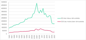 Figure 2 Revenu moyen des 10% des individus les mieux rémunérés et des 50% des individus aux revenus les plus faibles ; Source : WID