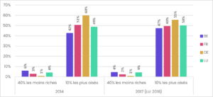 Ainsi, le rapport entre la part du patrimoine total détenue par les deux déciles inférieurs de la distribution et celle détenue par le dixième le plus aisé est de 1 à 12 en 2018 (contre de 1 à 6 environ pour le rapport entre les revenus après impôts et transferts sociaux moyens des 50% les moins bien rémunérés et les 10% de revenus les plus élevés).